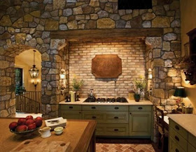 Not one plain wall here! They are all fancied up with mirrors, wallpaper, paint of course, stones, tile and more. Some are Pretty Neat!